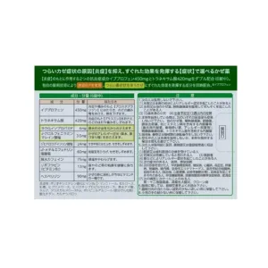 1.抗炎症成分イブプロフェン450mgとトラネキサム酸420mgをダブル配合(6錠中)。のどの痛み、発熱などにすぐれた効果を発揮します。